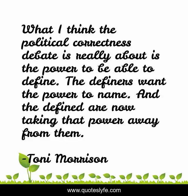This page presents the quote "What I think the political correctness debate is really about is the power to be able to define. The definers want the power to name. And the defined are now taking that power away from them.". Author of this quote is Toni Morrison. This quote is about politics, inspiration, communication,.