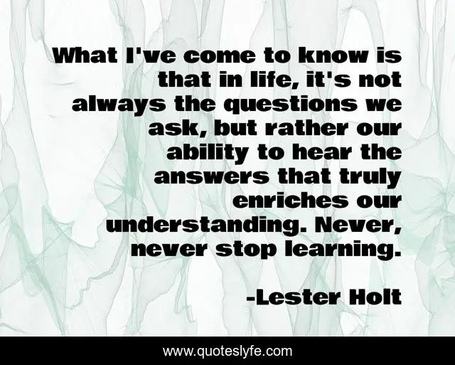 This page presents the quote "What I've come to know is that in life, it's not always the questions we ask, but rather our ability to hear the answers that truly enriches our understanding. Never, never stop learning.". Author of this quote is Lester Holt. This quote is about life, understanding,.