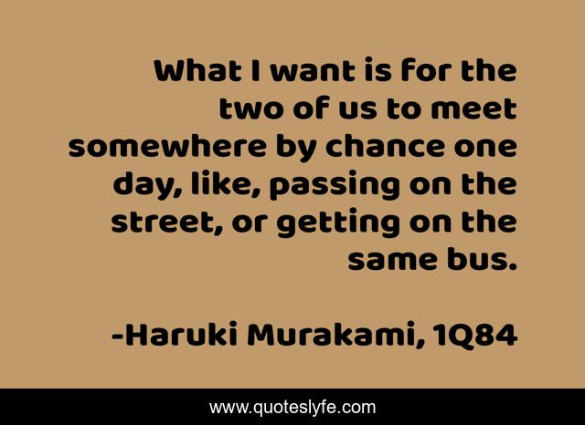 This page presents the quote "What I want is for the two of us to meet somewhere by chance one day, like, passing on the street, or getting on the same bus.". Author of this quote is Haruki Murakami, 1Q84. .