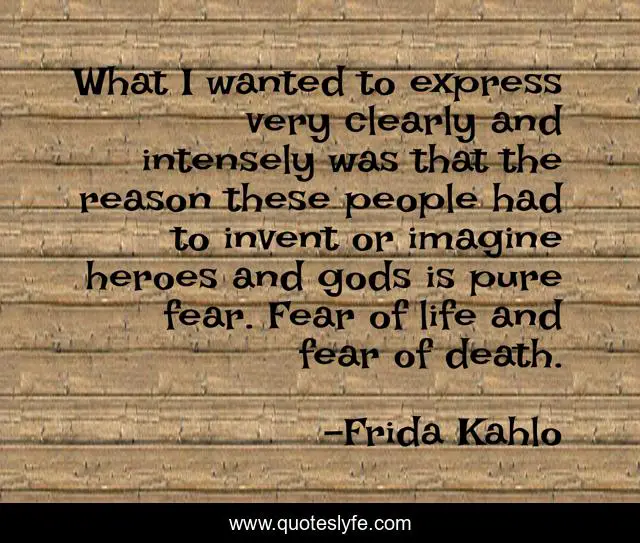 This page presents the quote "What I wanted to express very clearly and intensely was that the reason these people had to invent or imagine heroes and gods is pure fear. Fear of life and fear of death.". Author of this quote is Frida Kahlo. This quote is about life, death, religion, gods, imagination, make-believe, fear, heroes,.