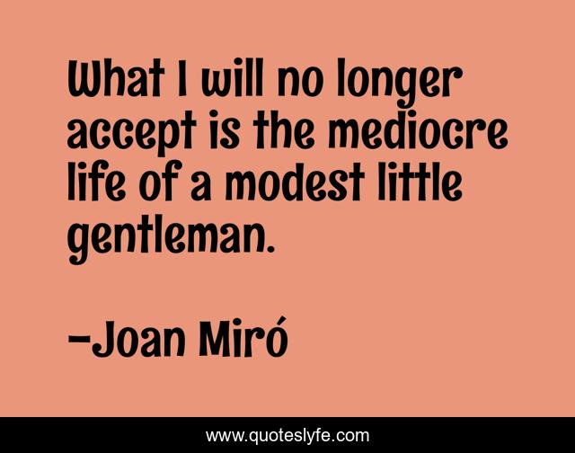 This page presents the quote "What I will no longer accept is the mediocre life of a modest little gentleman.". Author of this quote is Joan Miró. This quote is about life, acceptance, gentleman, modest,.