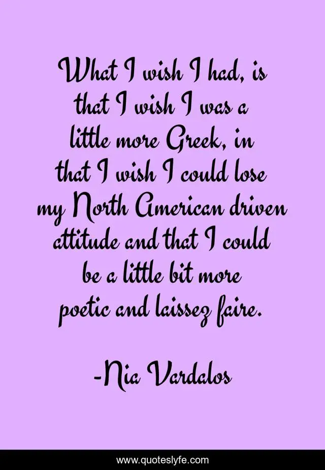 This page presents the quote "What I wish I had, is that I wish I was a little more Greek, in that I wish I could lose my North American driven attitude and that I could be a little bit more poetic and laissez faire.". Author of this quote is Nia Vardalos. This quote is about wish, american, little,.