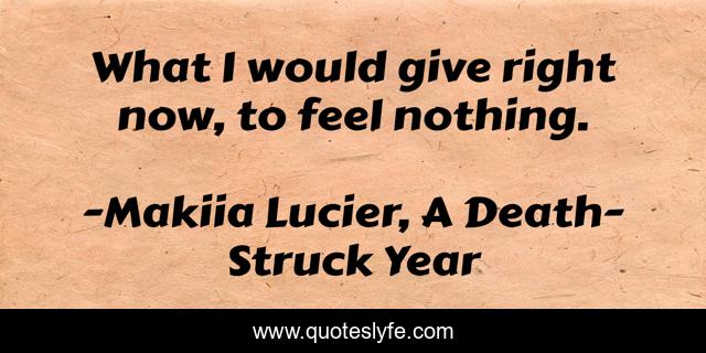 This page presents the quote "What I would give right now, to feel nothing.". Author of this quote is Makiia Lucier, A Death-Struck Year. This quote is about loss, death, pain,.