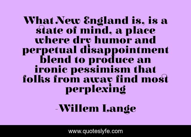 This page presents the quote "What New England is, is a state of mind, a place where dry humor and perpetual disappointment blend to produce an ironic pessimism that folks from away find most perplexing". Author of this quote is Willem Lange. This quote is about humor, pessimism, dry-humor, disappointment, new-england, perplexing, wry,.