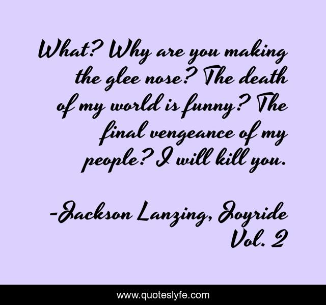 This page presents the quote "What? Why are you making the glee nose? The death of my world is funny? The final vengeance of my people? I will kill you.". Author of this quote is Jackson Lanzing, Joyride Vol. 2. This quote is about kolstak, funny, death, glee, joyride, revenge, seriousness, vengeance, humor,.