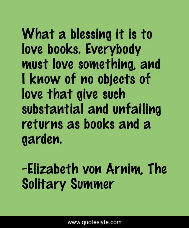 This page presents the quote "What a blessing it is to love books. Everybody must love something, and I know of no objects of love that give such substantial and unfailing returns as books and a garden.". Author of this quote is Elizabeth von Arnim, The Solitary Summer. This quote is about books, literature, reading, words,.