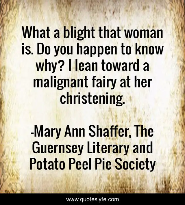 This page presents the quote "What a blight that woman is. Do you happen to know why? I lean toward a malignant fairy at her christening.". Author of this quote is Mary Ann Shaffer, The Guernsey Literary and Potato Peel Pie Society. .