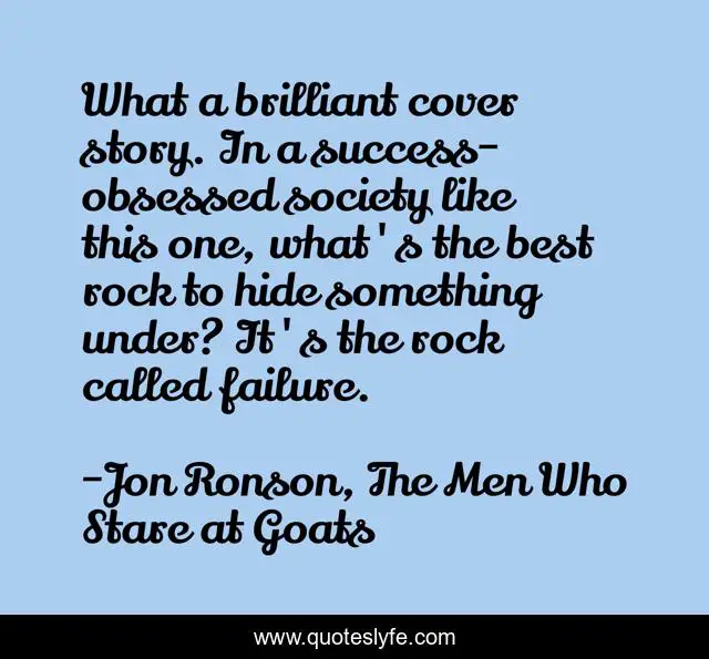This page presents the quote "What a brilliant cover story. In a success-obsessed society like this one, what's the best rock to hide something under? It's the rock called failure.". Author of this quote is Jon Ronson, The Men Who Stare at Goats. This quote is about society-denial, failure, society-problem, success,.