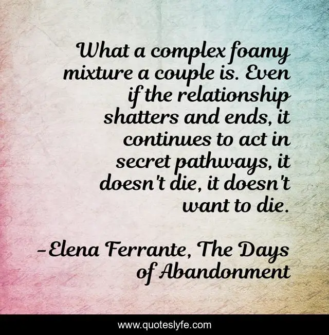 This page presents the quote "What a complex foamy mixture a couple is. Even if the relationship shatters and ends, it continues to act in secret pathways, it doesn't die, it doesn't want to die.". Author of this quote is Elena Ferrante, The Days of Abandonment. .