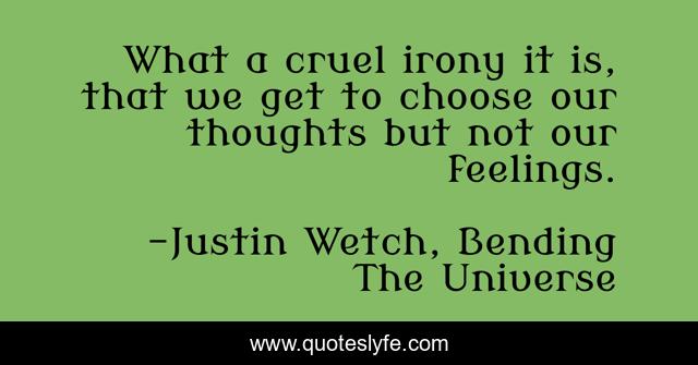 This page presents the quote "What a cruel irony it is, that we get to choose our thoughts but not our feelings.". Author of this quote is Justin Wetch, Bending The Universe. This quote is about irony, cruel-irony, poetry, feelings, dark-poetry, quotes-for-instagram, thoughts,.