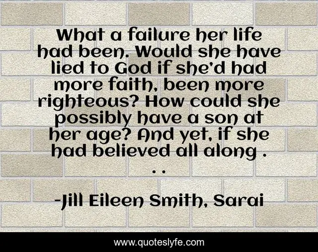 This page presents the quote "What a failure her life had been. Would she have lied to God if she’d had more faith, been more righteous? How could she possibly have a son at her age? And yet, if she had believed all along . . .". Author of this quote is Jill Eileen Smith, Sarai. .