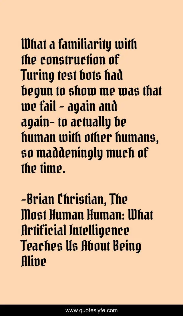 This page presents the quote "What a familiarity with the construction of Turing test bots had begun to show me was that we fail - again and again- to actually be human with other humans, so maddeningly much of the time.". Author of this quote is Brian Christian, The Most Human Human: What Artificial Intelligence Teaches Us About Being Alive. This quote is about life, humanity,.