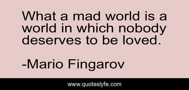 This page presents the quote "What a mad world is a world in which nоbody deserves to be loved.". Author of this quote is Mario Fingarov. This quote is about betrayal, love, disloyalty, affection,.