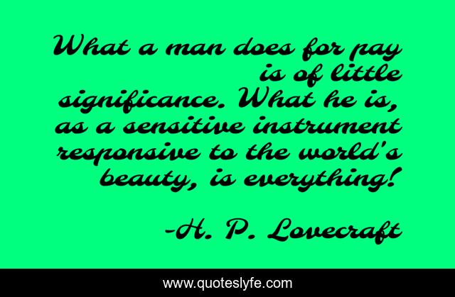 This page presents the quote "What a man does for pay is of little significance. What he is, as a sensitive instrument responsive to the world's beauty, is everything!". Author of this quote is H. P. Lovecraft. This quote is about world, little, man,.