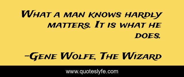 This page presents the quote "What a man knows hardly matters. It is what he does.". Author of this quote is Gene Wolfe, The Wizard. .