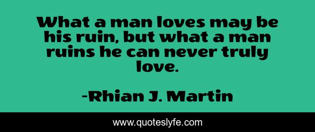 This page presents the quote "What a man loves may be his ruin, but what a man ruins he can never truly love.". Author of this quote is Rhian J. Martin. This quote is about ruination, love, humanity, affection, mankind,.
