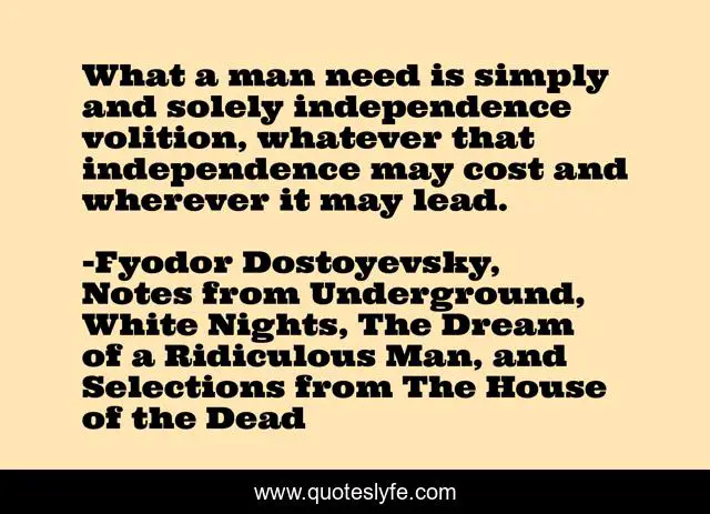 This page presents the quote "What a man need is simply and solely independence volition, whatever that independence may cost and wherever it may lead.". Author of this quote is Fyodor Dostoyevsky, Notes from Underground, White Nights, The Dream of a Ridiculous Man, and Selections from The House of the Dead. This quote is about independence, man,.