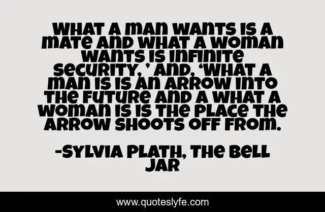 This page presents the quote "What a man wants is a mate and what a woman wants is infinite security, ’ and, ‘What a man is is an arrow into the future and a what a woman is is the place the arrow shoots off from.". Author of this quote is Sylvia Plath, The Bell Jar. This quote is about love, men, marriage, affection, women,.