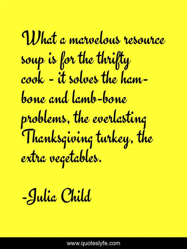 This page presents the quote "What a marvelous resource soup is for the thrifty cook - it solves the ham-bone and lamb-bone problems, the everlasting Thanksgiving turkey, the extra vegetables.". Author of this quote is Julia Child. This quote is about soup, vegetables, problems,.