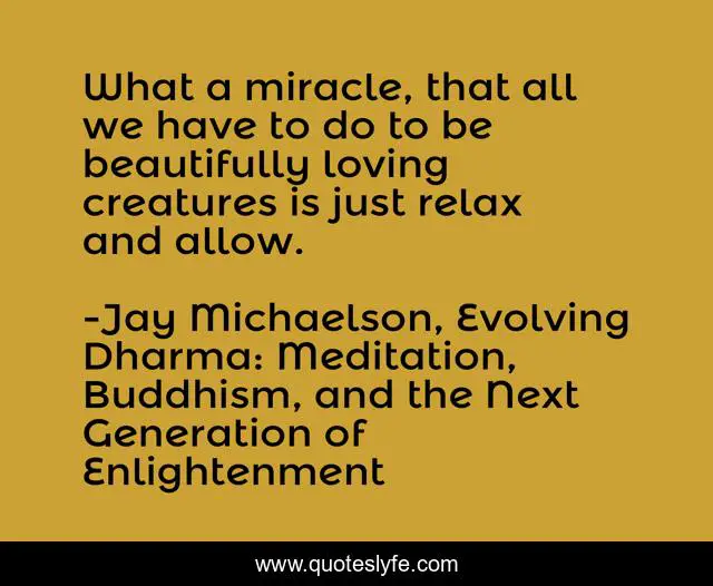 This page presents the quote "What a miracle, that all we have to do to be beautifully loving creatures is just relax and allow.". Author of this quote is Jay Michaelson, Evolving Dharma: Meditation, Buddhism, and the Next Generation of Enlightenment. This quote is about dharma, buddhism, meditation, religion,.