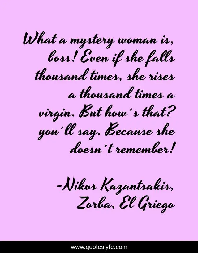 This page presents the quote "What a mystery woman is, boss! Even if she falls thousand times, she rises a thousand times a virgin. But how´s that? you´ll say. Because she doesn´t remember!". Author of this quote is Nikos Kazantsakis, Zorba, El Griego. This quote is about mystery, virgin, woman,.