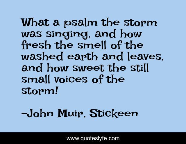 This page presents the quote "What a psalm the storm was singing, and how fresh the smell of the washed earth and leaves, and how sweet the still small voices of the storm!". Author of this quote is John Muir, Stickeen. .