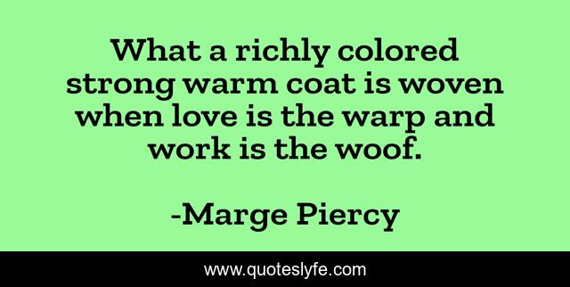 This page presents the quote "What a richly colored strong warm coat is woven when love is the warp and work is the woof.". Author of this quote is Marge Piercy. .