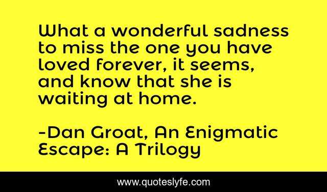 This page presents the quote "What a wonderful sadness to miss the one you have loved forever, it seems, and know that she is waiting at home.". Author of this quote is Dan Groat, An Enigmatic Escape: A Trilogy. This quote is about missing-you, missing, missing-someone, sadness, sad, waiting, waiting-for-you, miss,.