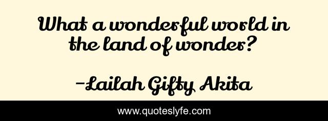 This page presents the quote "What a wonderful world in the land of wonder?". Author of this quote is Lailah Gifty Akita. This quote is about wise-sayings, wonderful, inspirational, enthusiasm, world, wonder,.