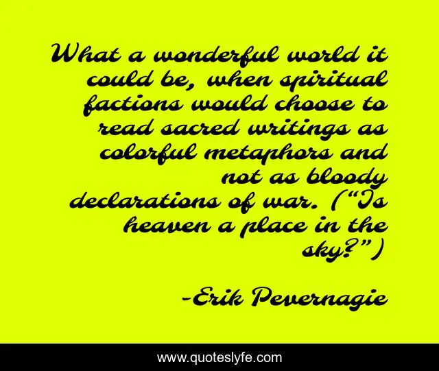 This page presents the quote "What a wonderful world it could be, when spiritual factions would choose to read sacred writings as colorful metaphors and not as bloody declarations of war. (“Is heaven a place in the sky?”)". Author of this quote is Erik Pevernagie. This quote is about declaration-of-war, spiritual, writings, colorful, faction, read, bloody, wohderful, choose,.