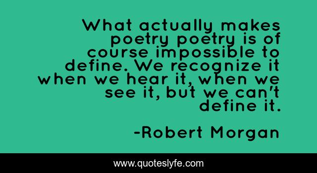 This page presents the quote "What actually makes poetry poetry is of course impossible to define. We recognize it when we hear it, when we see it, but we can't define it.". Author of this quote is Robert Morgan. This quote is about impossible, see, recognize,.