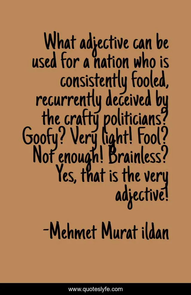 This page presents the quote "What adjective can be used for a nation who is consistently fooled, recurrently deceived by the crafty politicians? Goofy? Very light! Fool? Not enough! Brainless? Yes, that is the very adjective!". Author of this quote is Mehmet Murat ildan. This quote is about mehmet-murat-ildan, turkish-playwrights, turkish-wisdom-words, turkish-aphorisms, turkish, turkish-sayings, politicians, turkish-writers, turkish-literature,.