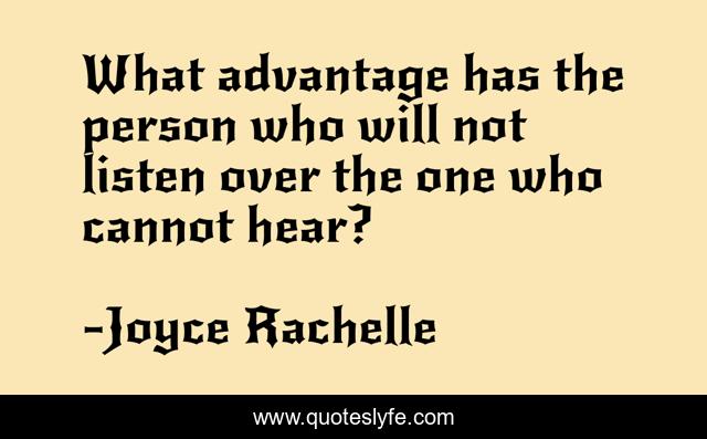This page presents the quote "What advantage has the person who will not listen over the one who cannot hear?". Author of this quote is Joyce Rachelle. This quote is about open-mind, hearing, open-mindedness, small-minds, toxic-people, listening, listen,.