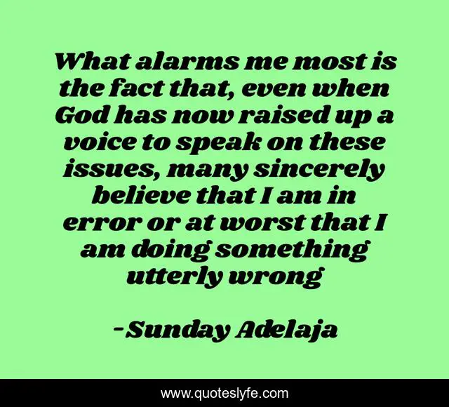 This page presents the quote "What alarms me most is the fact that, even when God has now raised up a voice to speak on these issues, many sincerely believe that I am in error or at worst that I am doing something utterly wrong". Author of this quote is Sunday Adelaja. This quote is about raised, sincerely, at, issues, speak, even, believe, god, has,.