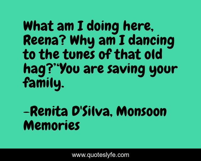 This page presents the quote "What am I doing here, Reena? Why am I dancing to the tunes of that old hag?’‘You are saving your family.". Author of this quote is Renita D'Silva, Monsoon Memories. This quote is about indian-fiction, women-s-fiction, india,.