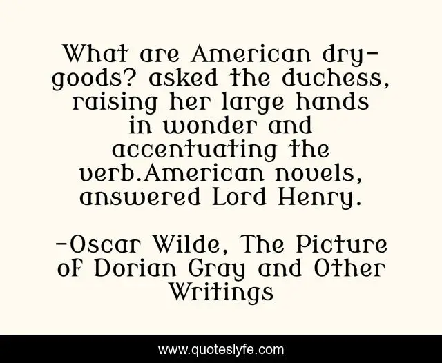 "Oscar Wilde, The Picture of Dorian Gray and Other Writings Quotes." Quoteslyfe.com, 2025. Sat. 06 Dec. 2025. <https://www.quoteslyfe.com/quote/What-are-American-dry-goods-asked-the-43307>.