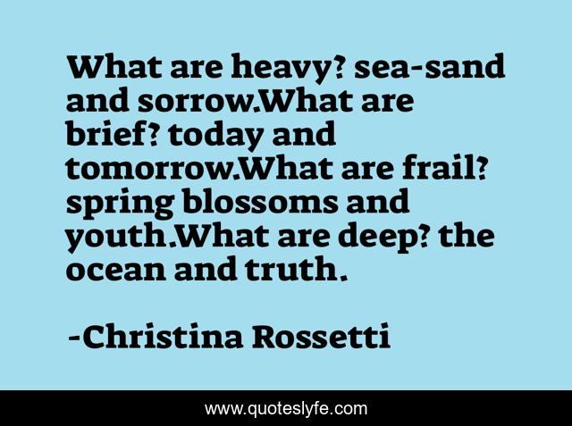 This page presents the quote "What are heavy? sea-sand and sorrow.What are brief? today and tomorrow.What are frail? spring blossoms and youth.What are deep? the ocean and truth.". Author of this quote is Christina Rossetti. This quote is about grief, sorrow, poetry, youth, depth, truth,.