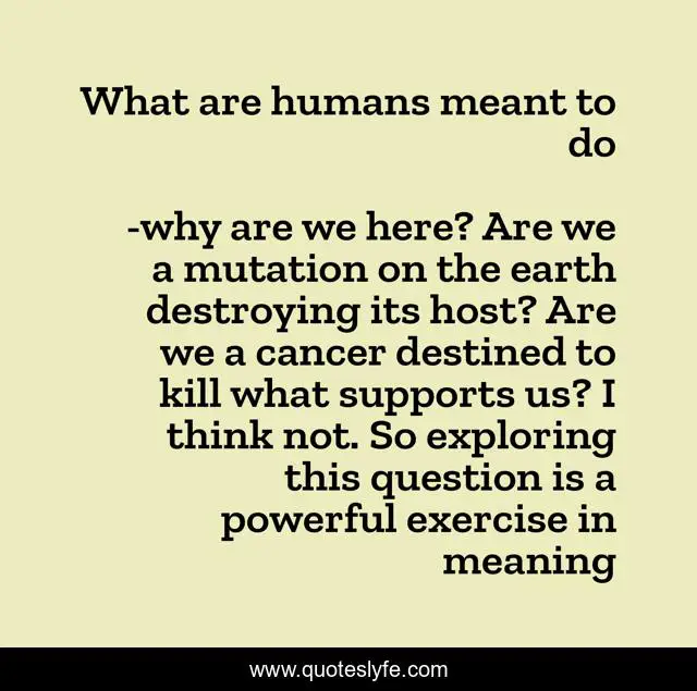 "why are we here? Are we a mutation on the earth destroying its host? Are we a cancer destined to kill what supports us? I think not. So exploring this question is a powerful exercise in meaning Quotes." Quoteslyfe.com, 2025. Fri. 05 Dec. 2025. <https://www.quoteslyfe.com/quote/What-are-humans-meant-to-do-142412>.
