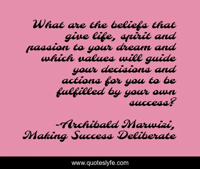 This page presents the quote "What are the beliefs that give life, spirit and passion to your dream and which values will guide your decisions and actions for you to be fulfilled by your own success?". Author of this quote is Archibald Marwizi, Making Success Deliberate. This quote is about life, success, behaviour, attitude, legacy, growth, purpose, inspirational, leadership,.