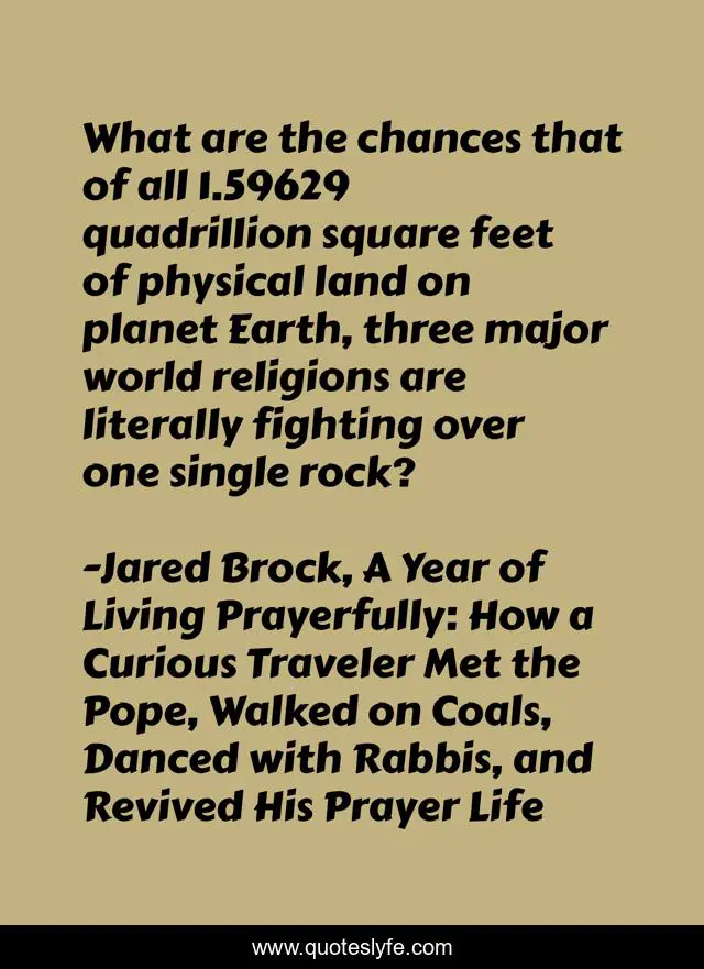 This page presents the quote "What are the chances that of all 1.59629 quadrillion square feet of physical land on planet Earth, three major world religions are literally fighting over one single rock?". Author of this quote is Jared Brock, A Year of Living Prayerfully: How a Curious Traveler Met the Pope, Walked on Coals, Danced with Rabbis, and Revived His Prayer Life. This quote is about holy-city, religious-wars, muslim, judaism, world-religion, peace, christianity, religion, jerusalem,.