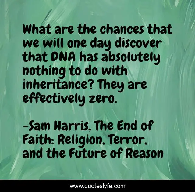 This page presents the quote "What are the chances that we will one day discover that DNA has absolutely nothing to do with inheritance? They are effectively zero.". Author of this quote is Sam Harris, The End of Faith: Religion, Terror, and the Future of Reason. This quote is about science, evolution, inheritance, dna, natural-selection,.