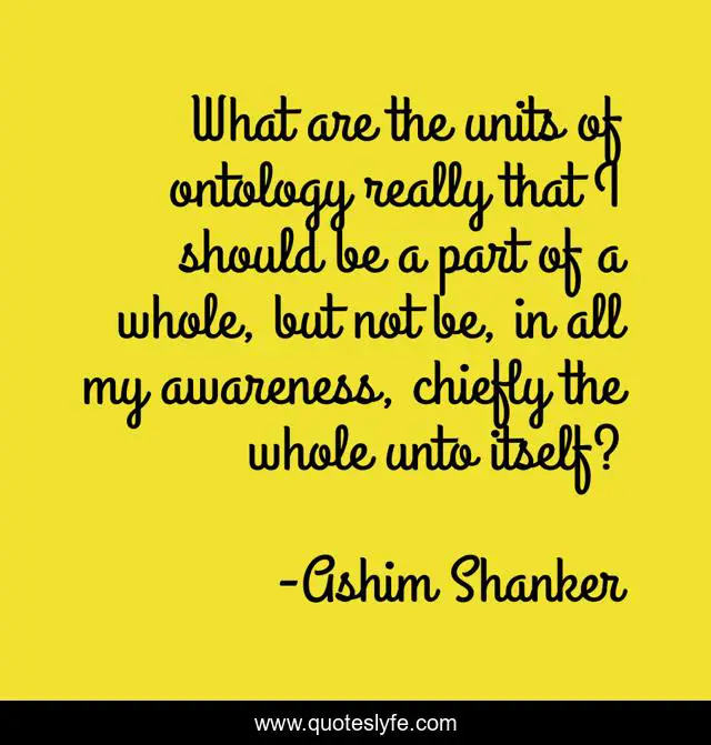 This page presents the quote "What are the units of ontology really that I should be a part of a whole, but not be, in all my awareness, chiefly the whole unto itself?". Author of this quote is Ashim Shanker. This quote is about post-truth, maya, truth, sentience, being, universe, part-of-the-process, philosophy, metaphysical,.