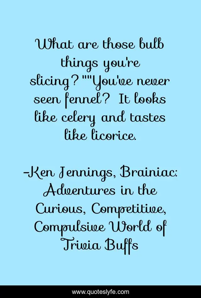 This page presents the quote "What are those bulb things you're slicing?""You've never seen fennel? It looks like celery and tastes like licorice.". Author of this quote is Ken Jennings, Brainiac: Adventures in the Curious, Competitive, Compulsive World of Trivia Buffs. This quote is about funny, licorice, celery, fennel, vegetable, comedy,.