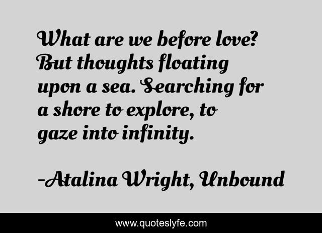 This page presents the quote "What are we before love? But thoughts floating upon a sea. Searching for a shore to explore, to gaze into infinity.". Author of this quote is Atalina Wright, Unbound. This quote is about enthusiasm, life, love, inspirational, affection,.