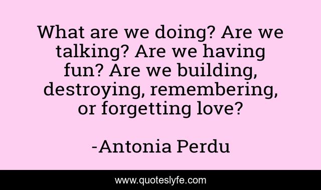 This page presents the quote "What are we doing? Are we talking? Are we having fun? Are we building, destroying, remembering, or forgetting love?". Author of this quote is Antonia Perdu. .