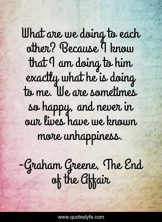 This page presents the quote "What are we doing to each other? Because I know that I am doing to him exactly what he is doing to me. We are sometimes so happy, and never in our lives have we known more unhappiness.". Author of this quote is Graham Greene, The End of the Affair. This quote is about literature, love, romantic, affection, philosophy,.