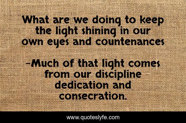 This page presents the quote "What are we doing to keep the light shining in our own eyes and countenances". Author of this quote is Much of that light comes from our discipline dedication and consecration.. .