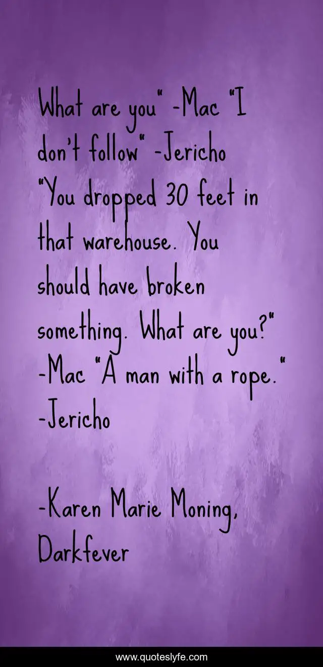 This page presents the quote "What are you" -Mac "I don't follow" -Jericho "You dropped 30 feet in that warehouse. You should have broken something. What are you?" -Mac "A man with a rope." -Jericho". Author of this quote is Karen Marie Moning, Darkfever. This quote is about funny, comedy,.