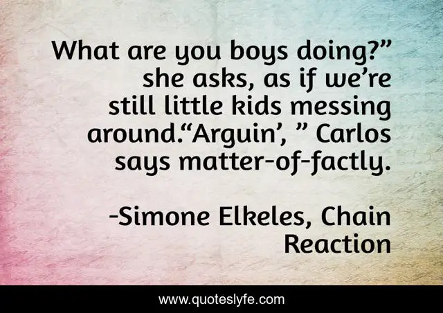 "Simone Elkeles, Chain Reaction Quotes." Quoteslyfe.com, 2025. Sat. 06 Dec. 2025. <https://www.quoteslyfe.com/quote/What-are-you-boys-doing-she-asks-228670>.