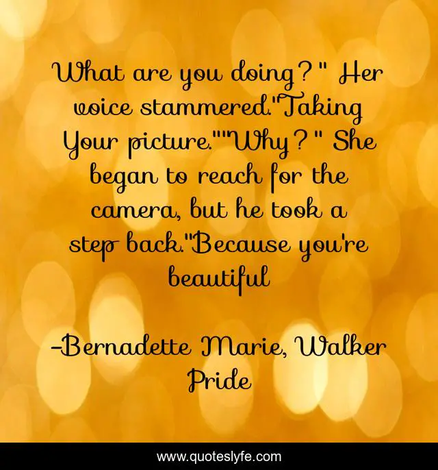 This page presents the quote "What are you doing?" Her voice stammered."Taking Your picture.""Why?" She began to reach for the camera, but he took a step back."Because you're beautiful". Author of this quote is Bernadette Marie, Walker Pride. This quote is about beautiful, love, affection,.